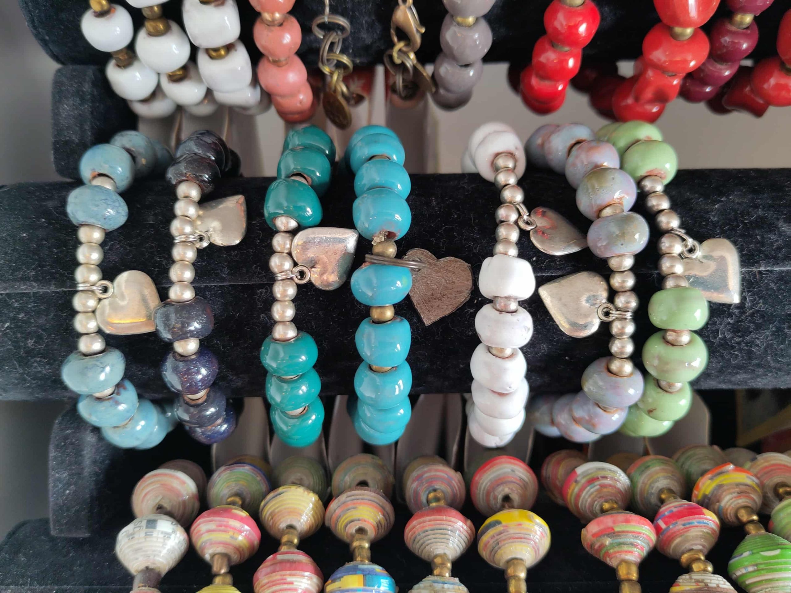Diese besonderen Armbänder werden in Haiti in liebevoller Handarbeit gefertigt. Jede einzelne Perle entsteht aus Ton der zentralen Hochebene, wird sorgfältig von Hand gerollt und anschließend bemalt.