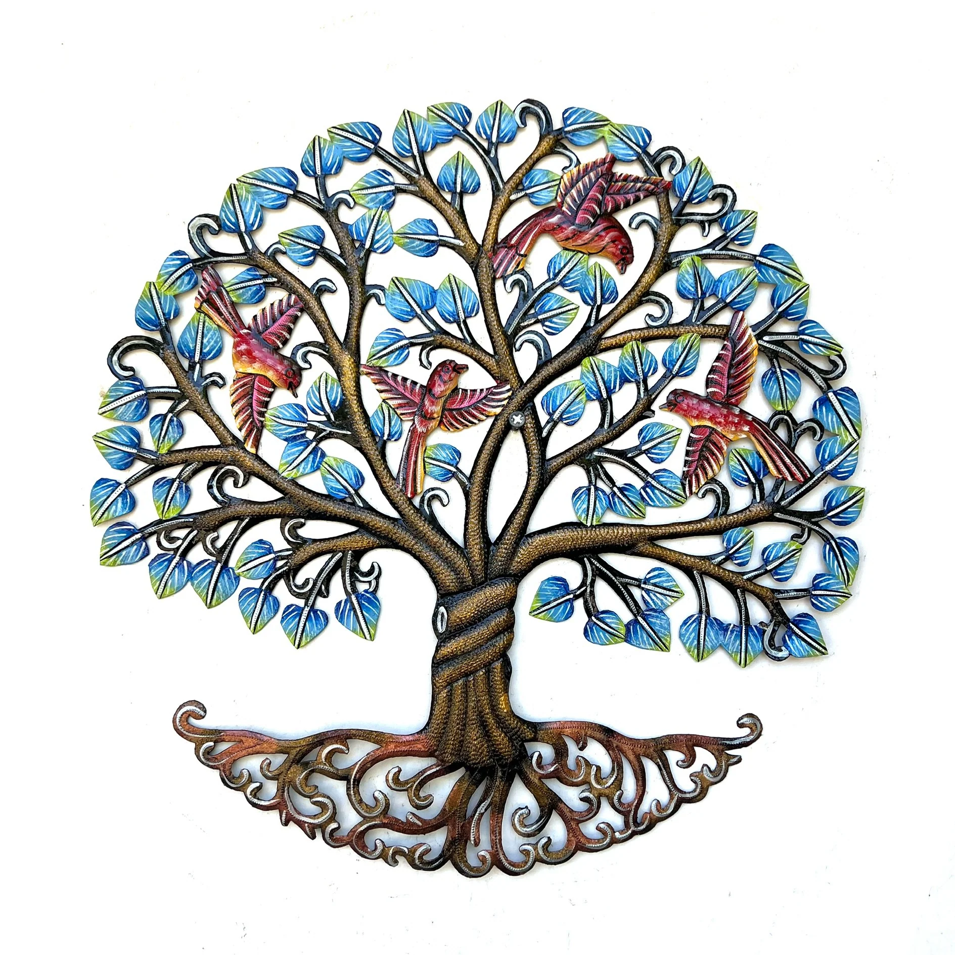 Colberts blauer Lebensbaum mit Vögeln wird in Haiti aus einem upcycelten Metallfass gefertigt. Mit einfachen Werkzeugen wie Hammer und Meißel formt der Kunsthandwerker jedes Stück von Hand, bevor der Baum anschließend mit Acrylfarben liebevoll bemalt wird. Jedes Exemplar ist ein echtes Unikat und steht für nachhaltige Handarbeit und kreative Wiederverwertung.