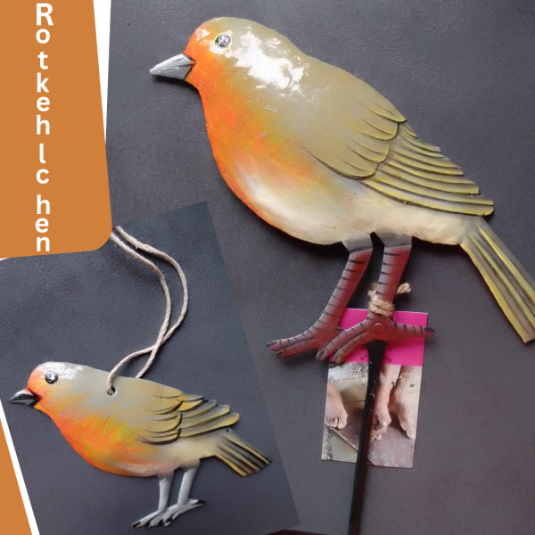 Deutschlands beliebtester Singvogel! Und nun gibt es ihn auch als Gartenstecker! Das Rotkehlchen wurde in Haiti aus einem Metallfass gemeißelt und mit Acrylfarben per Hand bemalt. Der Vogel bedeutet faire Arbeitsplätze für Papas in Haiti. Dieses Produkt gibt es auch als Anhänger!