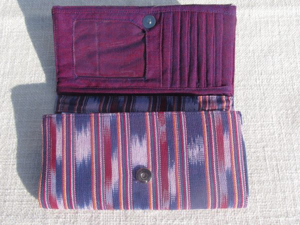 Unsere Clutch hat alles, was du brauchst um organisiert zu bleiben – viel Platz und viele Fächer! Eine Seite hat sieben Kartenschlitze und ein Fensterchen für den Ausweis sowie ein Fach groß genug für Scheine. Die andere Seite hat zwei große Fächer, ein Fach mit Reißverschluss für Münzen und vier kleine Fächer für Schlüssel oder andere Kleinigkeiten. Alles faltet glatt zusammen und wird mit einem magnetischen Druckknopf geschlossen. Traditionelle handgewebte Baumwolle aus Guatemala mit drei Mustern zur Auswahl.